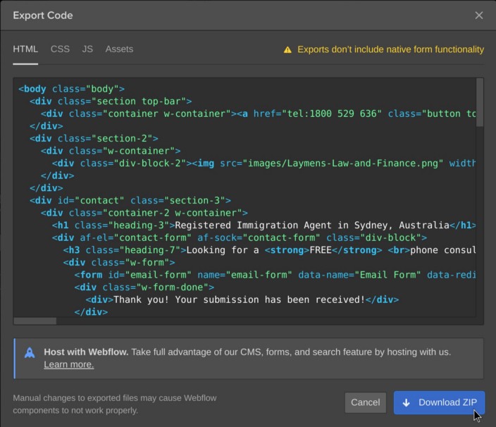 unzip ~/Downloads/project.webflow.zip -d .appfairyAbove: Exporting the project and unzipping it to